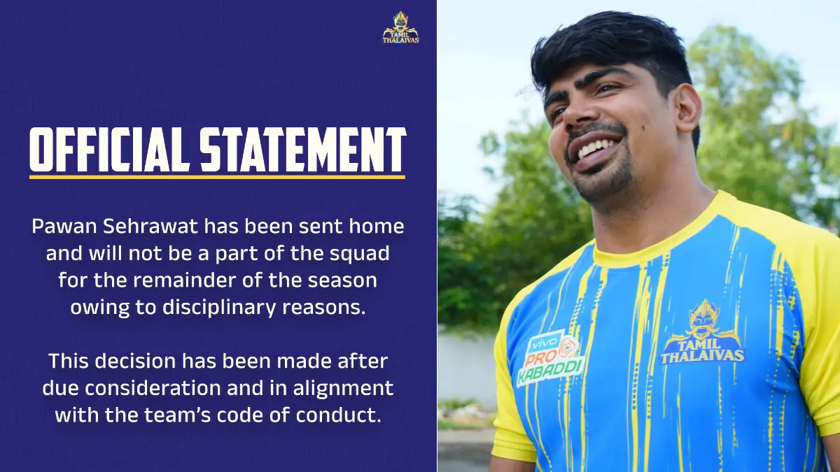 तमिल थलाइवाज ने आधिकारिक बयान में कहा है कि पवन सहरावत को अनुशासनात्मक कारणों से घर भेजा गया है। वह अब इस सीजन में वापसी नहीं करेंगे।